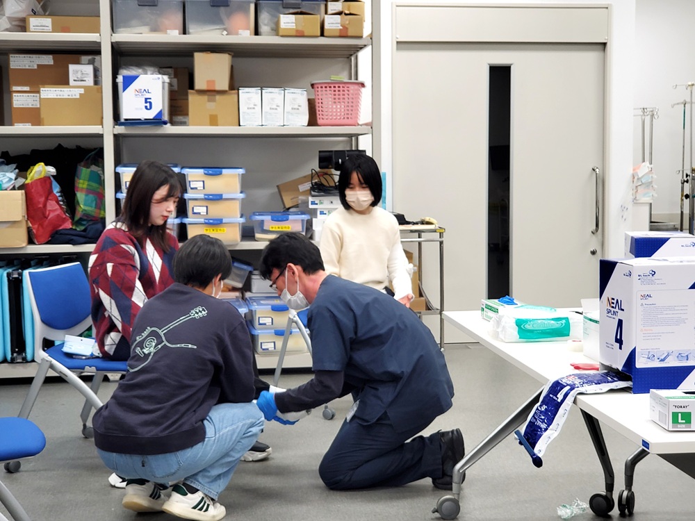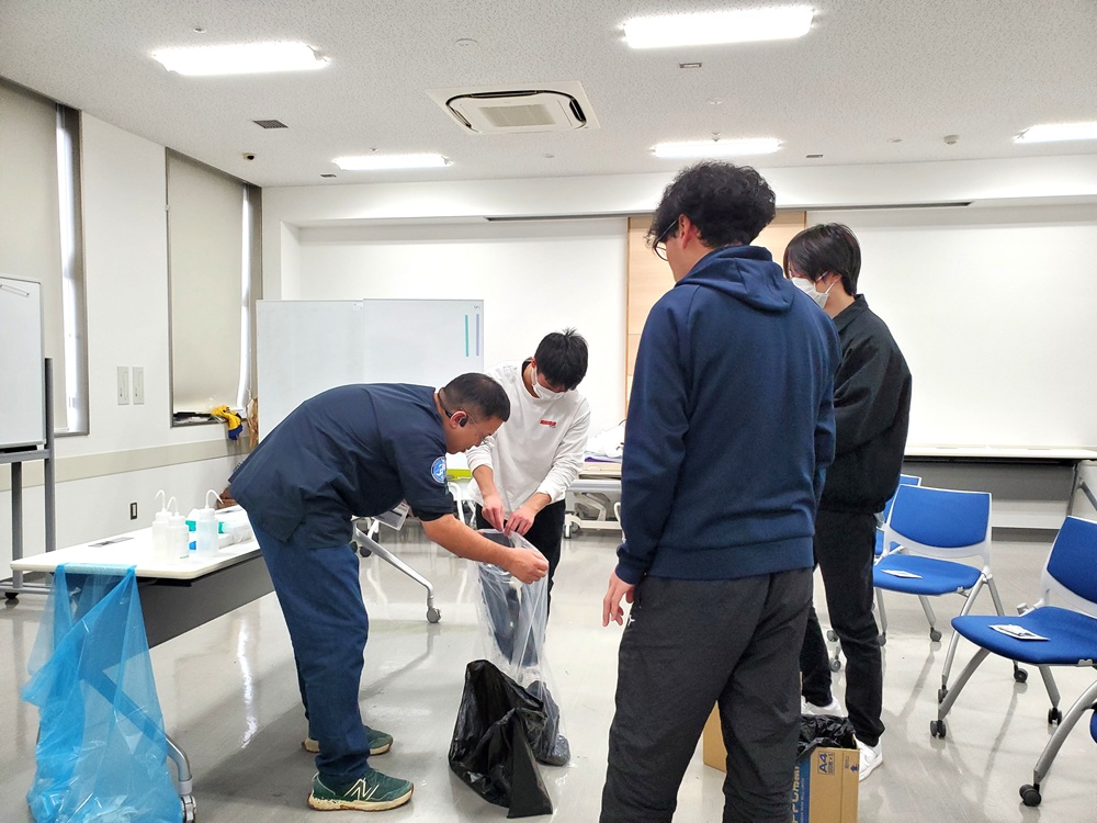 レクチャー後、トリアージ、災害トイレ、包帯の3つのブースに分かれて実習を行いました。
